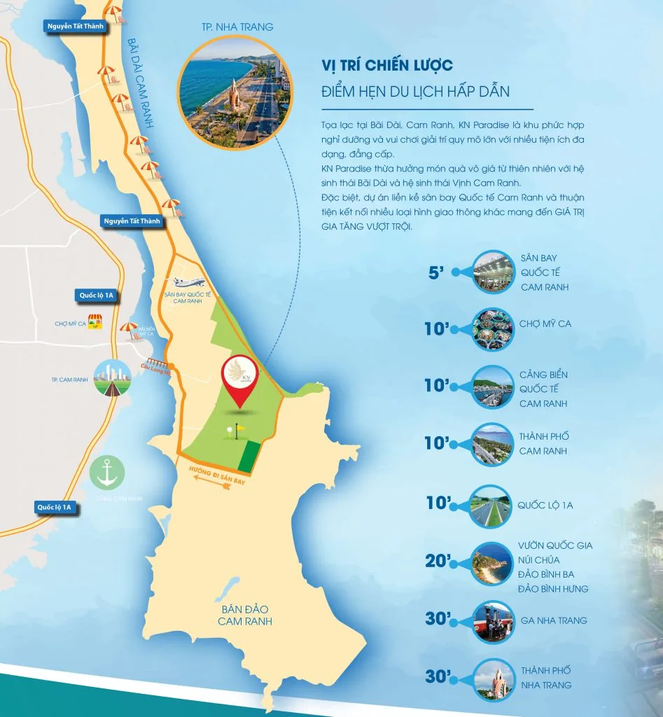 - Vị trí dự án: Đường Nguyễn Tất Thành, Bãi Dài, Thành phố Cam Ranh, Tỉnh Khánh Hòa – KN Paradise