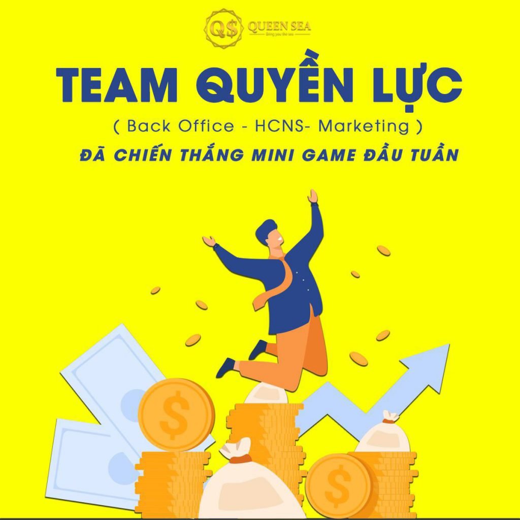 Xin chúc mừng Team Quyền lực với sự góp mặt của liên minh Backoffice – HCNS – Marketing đã giành chiến thắng mini game đầu tuần của QUEEN SEA và nhận giải thưởng hấp dẫn từ ban tổ chức. Chắc chắn rằng đây sẽ là mà Bộ phận Back office – HCNS – Marketing khẳng định với QUEEN SEA rằng dù trong công việc họ là những người hỗ trợ thầm lặng nhưng trên các cuộc thi thì sức mạnh, năng lực và sự sáng tạo của họ không hề thua bất cứ ai.