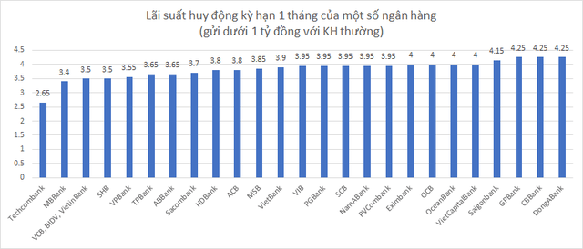 Chẳng hạn, ở kỳ hạn 1 tháng – 3 tháng, Vietcombank niêm yết lãi suất huy động ở mức 3,5%-3,8%/năm, cao hơn Techcombank gần 1%/năm. Thậm chí, nhiều ngân hàng nhỏ đang huy động lãi suất huy động trên 4%/năm, cao hơn Techcombank tới 1,5-1,7%/năm.